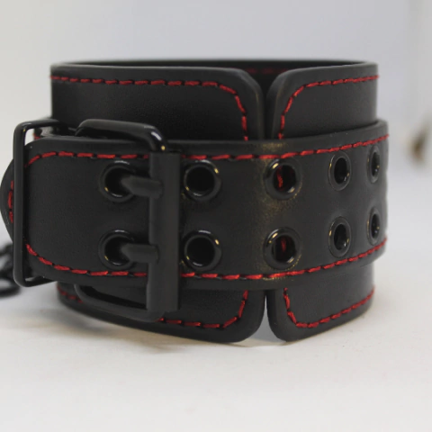 Com acabamento robusto e acolchoado, ela oferece contenção firme e confortável ao redor dos tornozelos, proporcionando segurança e prazer durante sessões prolongadas. O visual fetichista é reforçado pelas costuras vermelhas contrastantes e pelo design marcante, enquanto a corrente metálica adiciona um toque de controle e sensualidade à experiência.
